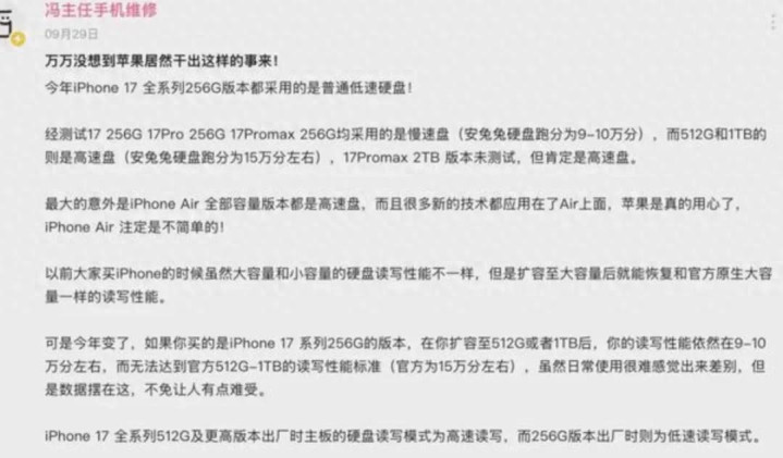 最近,关于iPhone 17全系存储限速的消息在数码圈炸开了锅。一位手机维修技术博主通过实测发现,iPhone 17、iPhone 17 Pro以及iPhone 17 Pro Max的256GB基础版本均搭载了读写速度较慢的存储芯片。