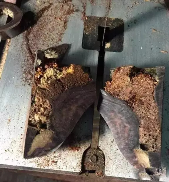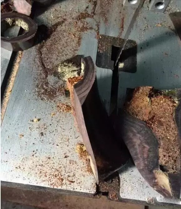 继续往下切了几刀,发现料子内部全部填充的都是锯末,可用的也就是料子外边缘的一圈,这就等同于自己花了不少钱,买到了一块废料。
