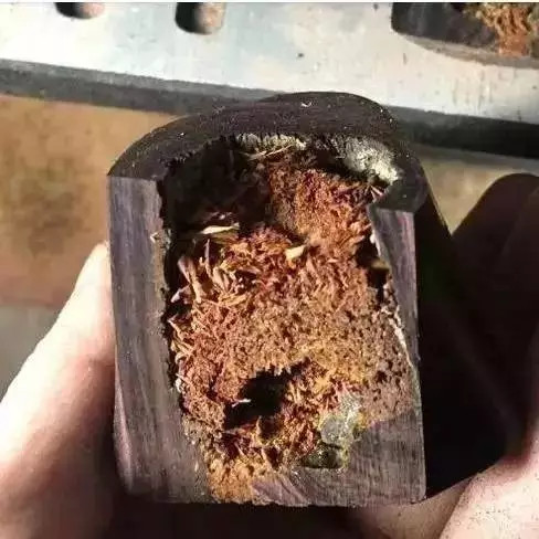 玩家将这块海南黄花梨料子切开之后瞬间就傻眼了,料子内部被填充上了密密麻麻的锯末子,真不知道是怎么塞进去的。自己拿到手之后盘玩了很长时间,竟然没有发现!